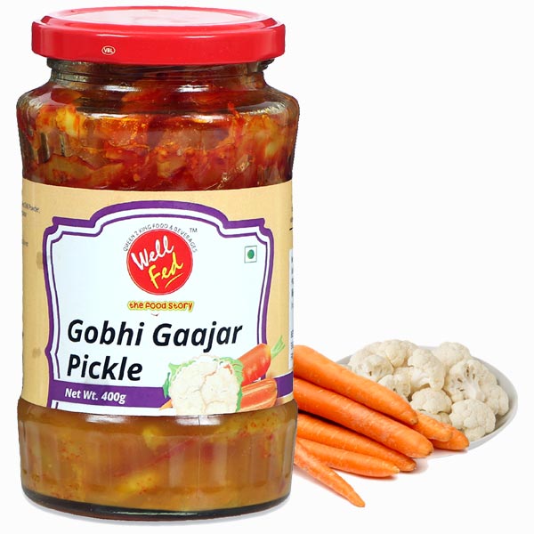 WellFed Gobhi Gaajar Pickle is a flavourful, exciting and tangy pickle made from naturally grown fresh carrots and cauliflowers. This is a Punjabi winter special Pickle, now available throughout the year from our pickling masters. With a perfect burst of sweet and tangy flavours, this Gobhi Gaajar pickle will definitely add a delight to your pulao times. Enjoy the crunch of Gobhi Gaajar pickle with dal, roti, parantha, khichdi, rice, dosa, Pongal or any dish of your choice.